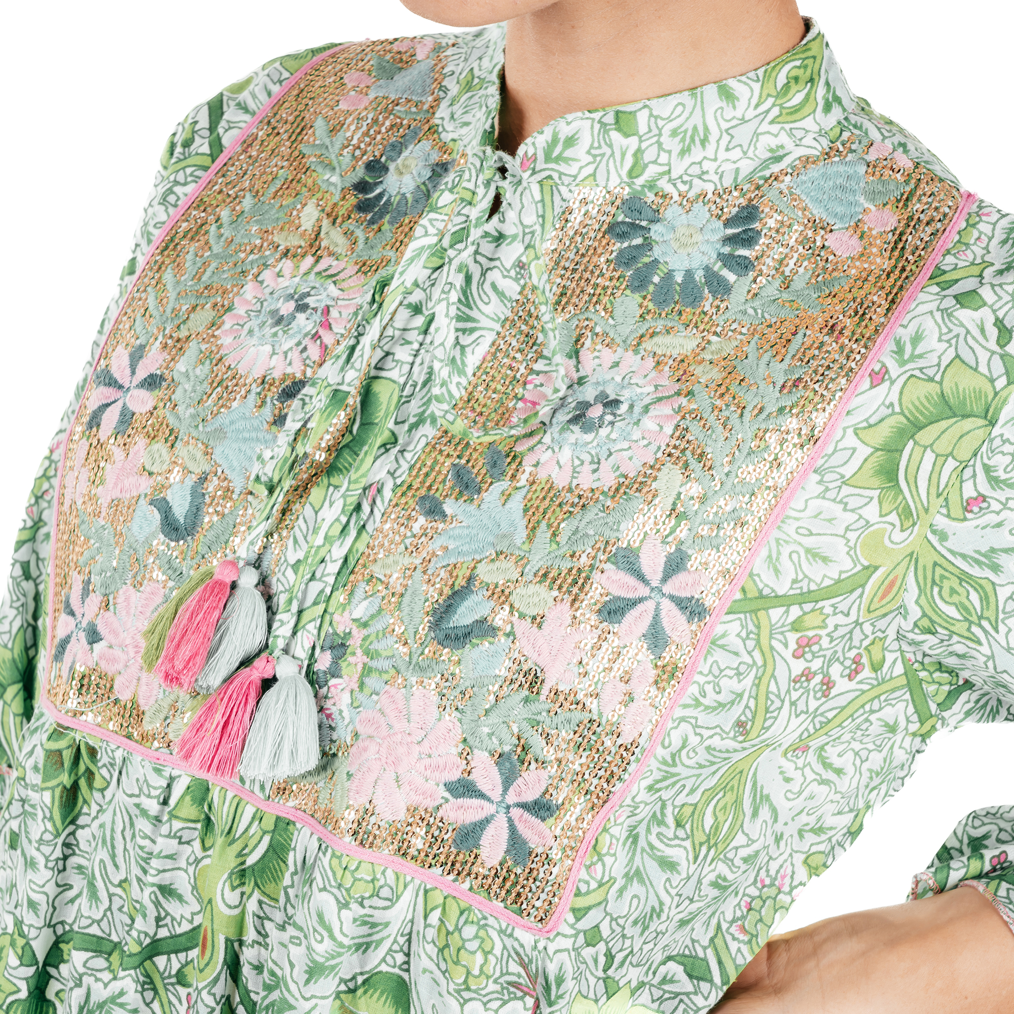Green Printed Short Dress With Embroidered And Gold Sequin Beading