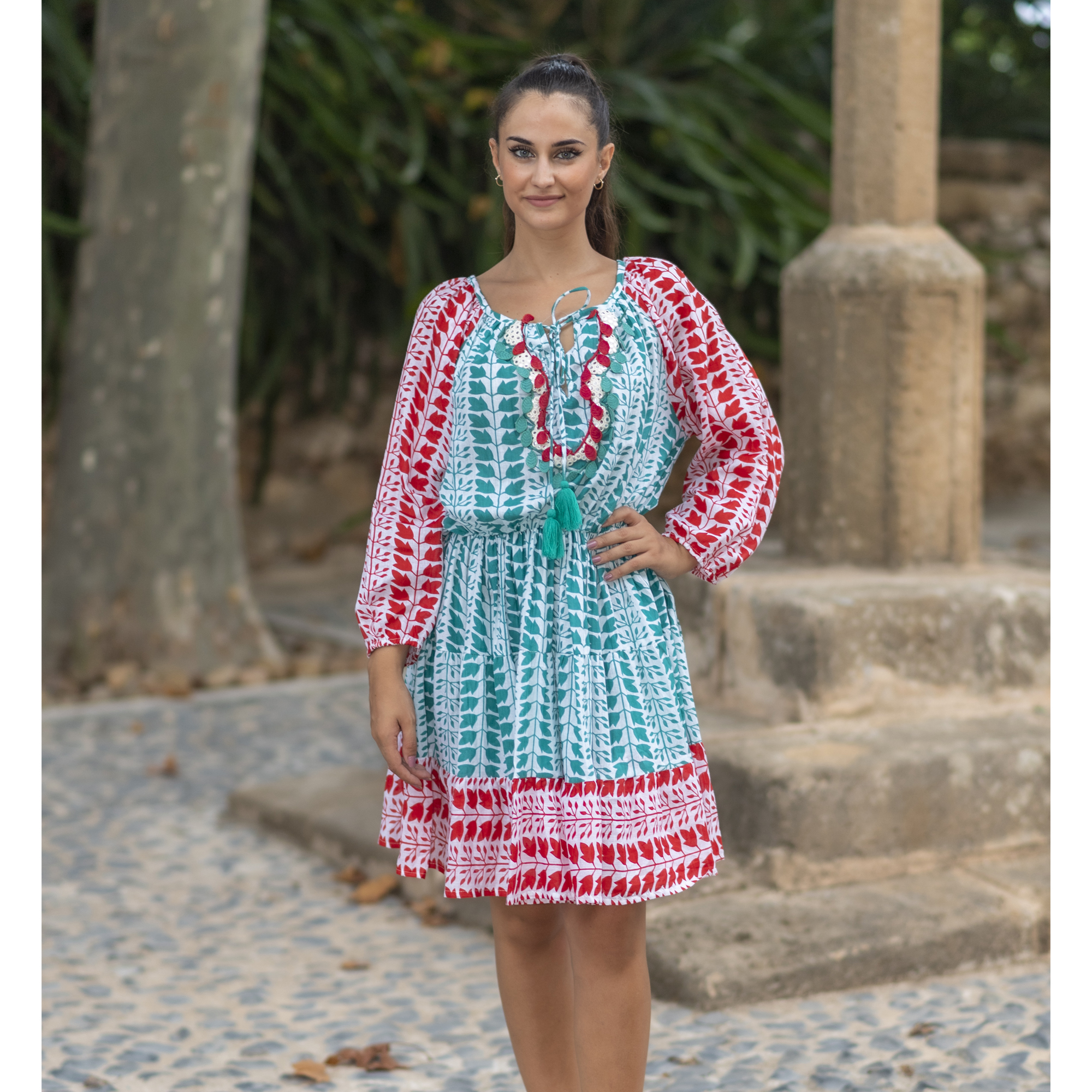 Isla Bonita Multicolor Printed Short Dress With Mirror Beading, 100% Cotton
