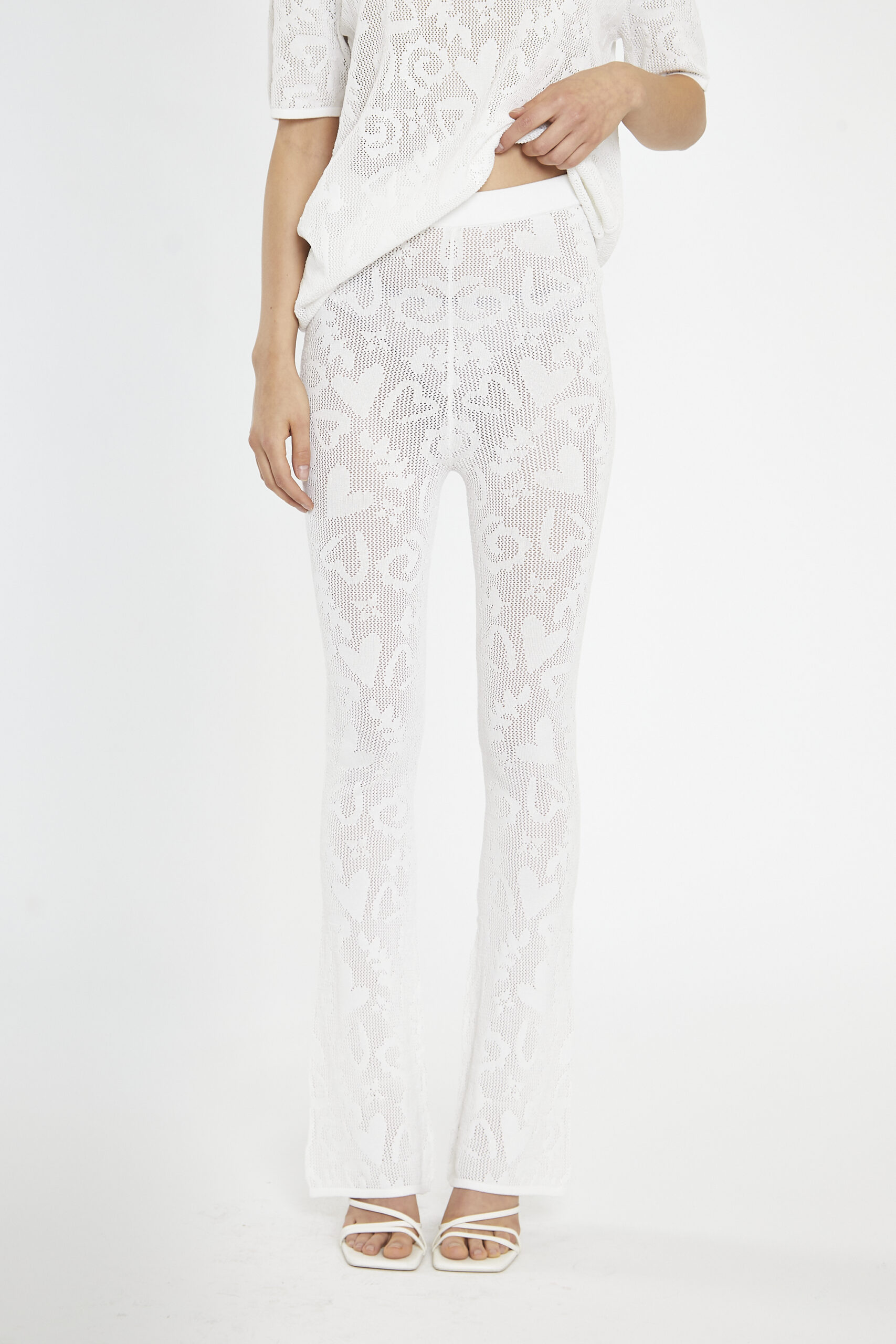 Womens  White Crochet sheer flared trousers. This knitted flared trousers is a must have this season. Featuring crochet detail this gorgeous piece will be your go-to for every occasion. Make sure to pair it  with the matching clover knitted top for that chic ultimate daytime look.