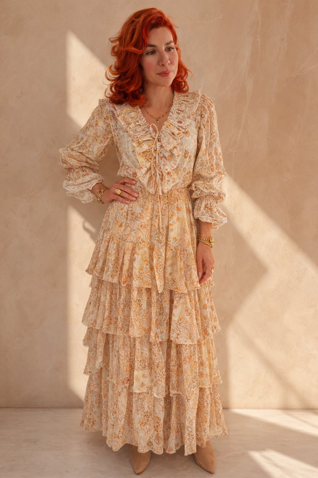 The Golden Romance Skirt & Blouse Set is a beautifully feminine two-piece outfit that combines romantic details with effortless elegance. Designed in a soft cream fabric with delicate golden floral print, this set features a charming ruffle blouse with a tie neckline and a flowing tiered maxi skirt that moves gracefully with every step.