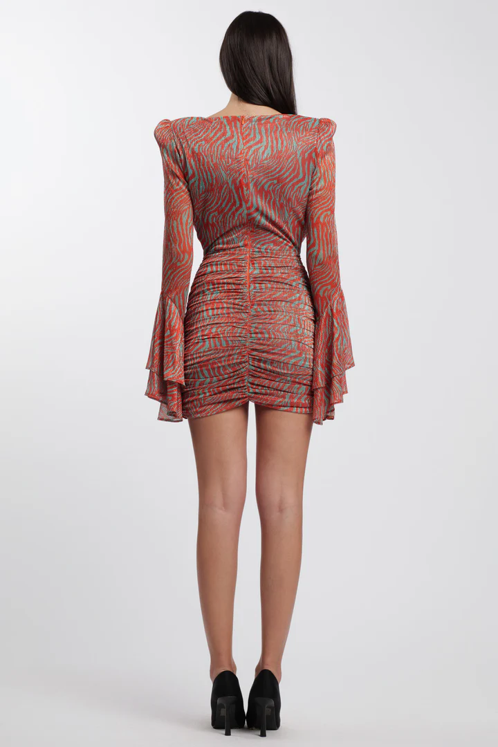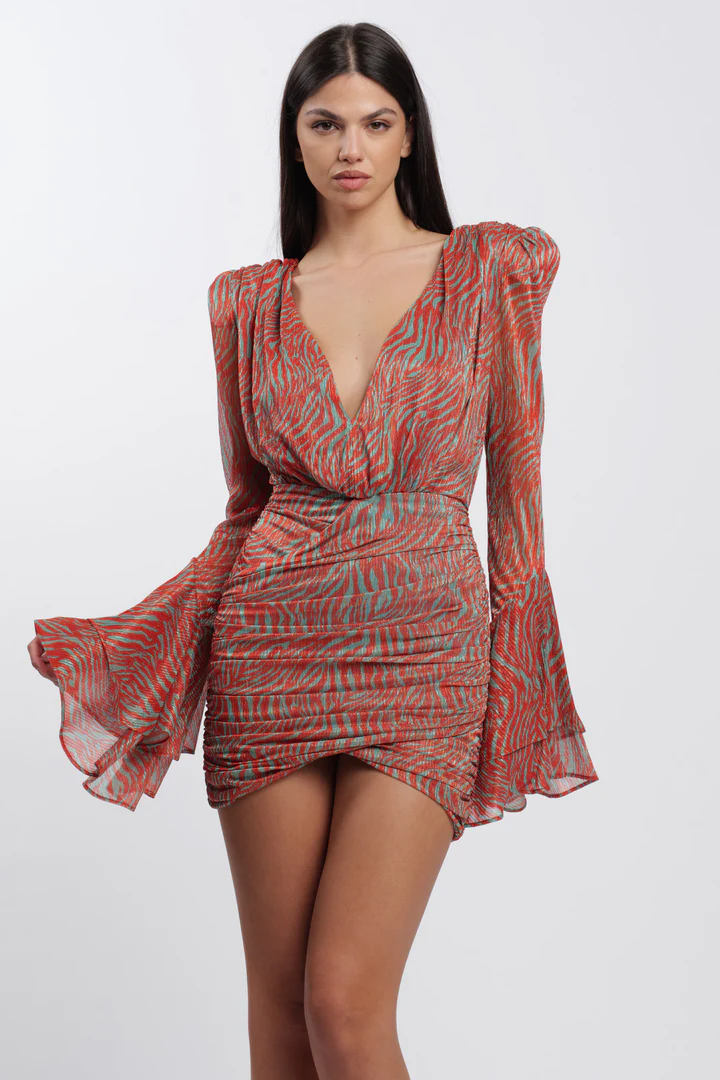 New Kelly Dress, mini dress in degradé pleated fabric perfect for any event. Bell sleeves and a V-neckline with padded straps for a touch of elegance. Fully lined for absolute comfort. Enjoy the style with this unique dress from the house of Silence Limited.