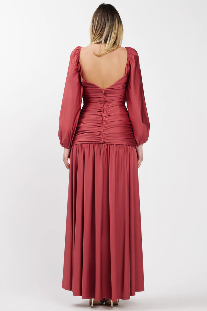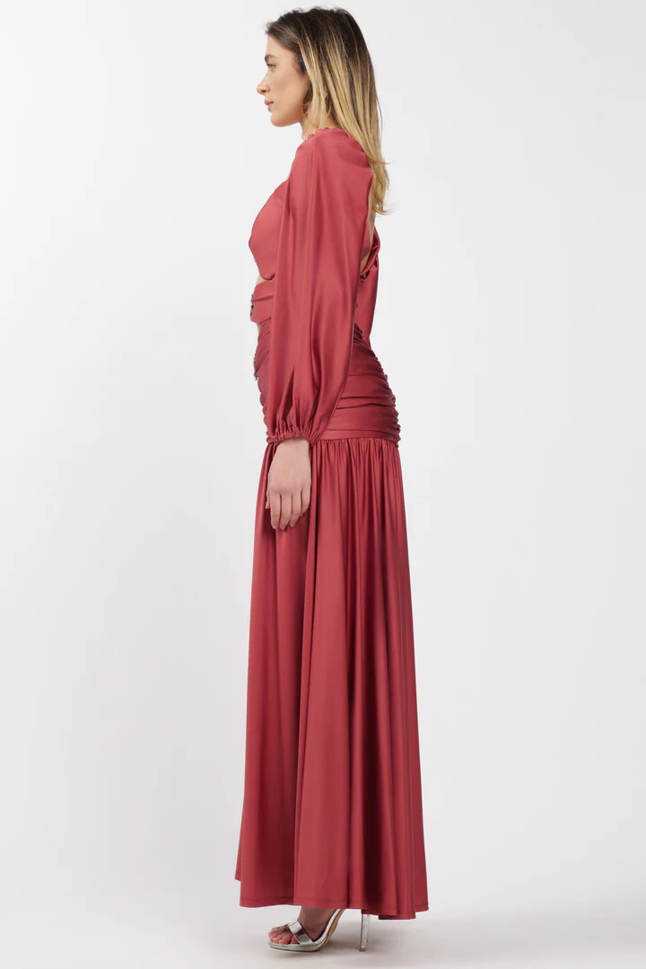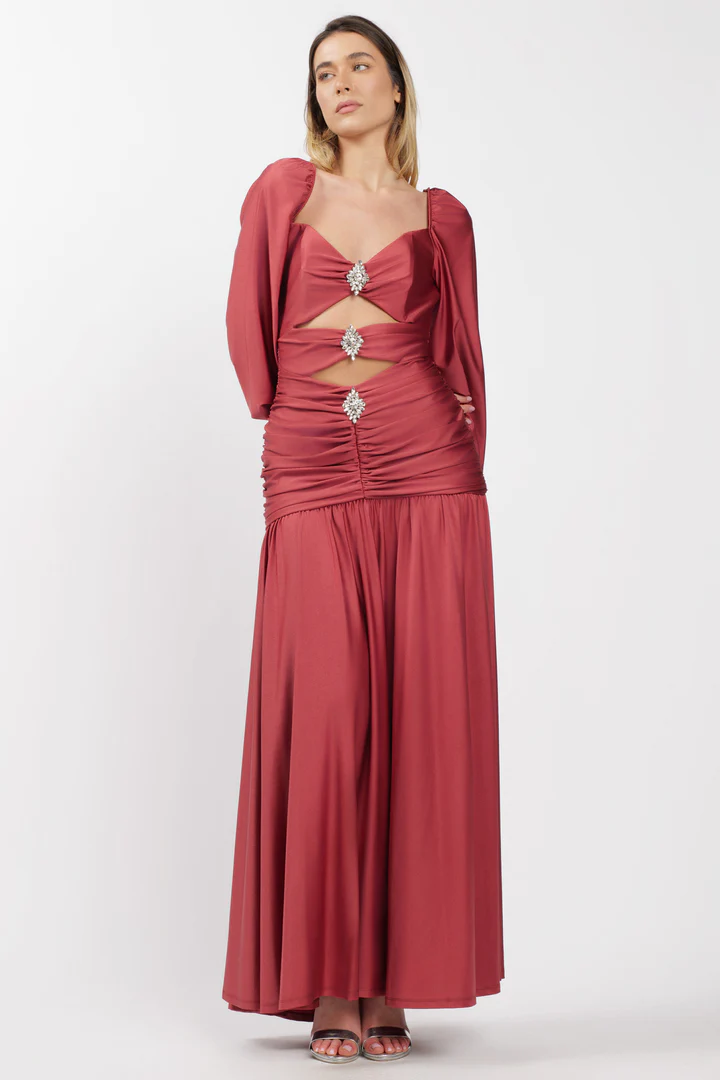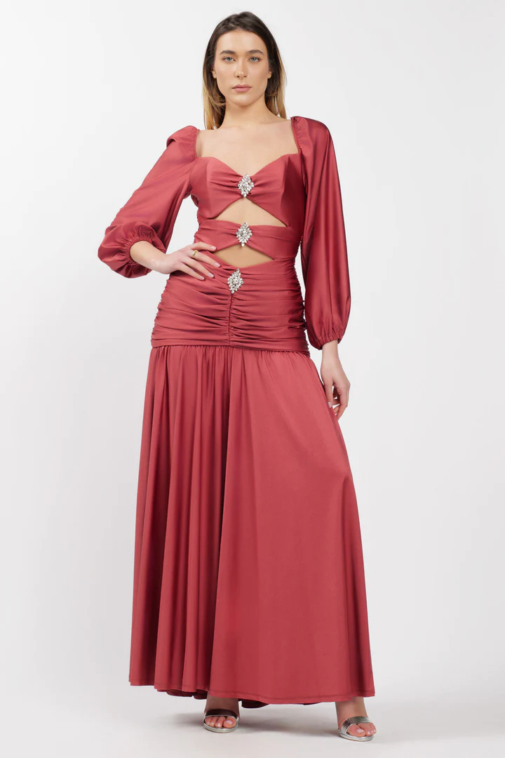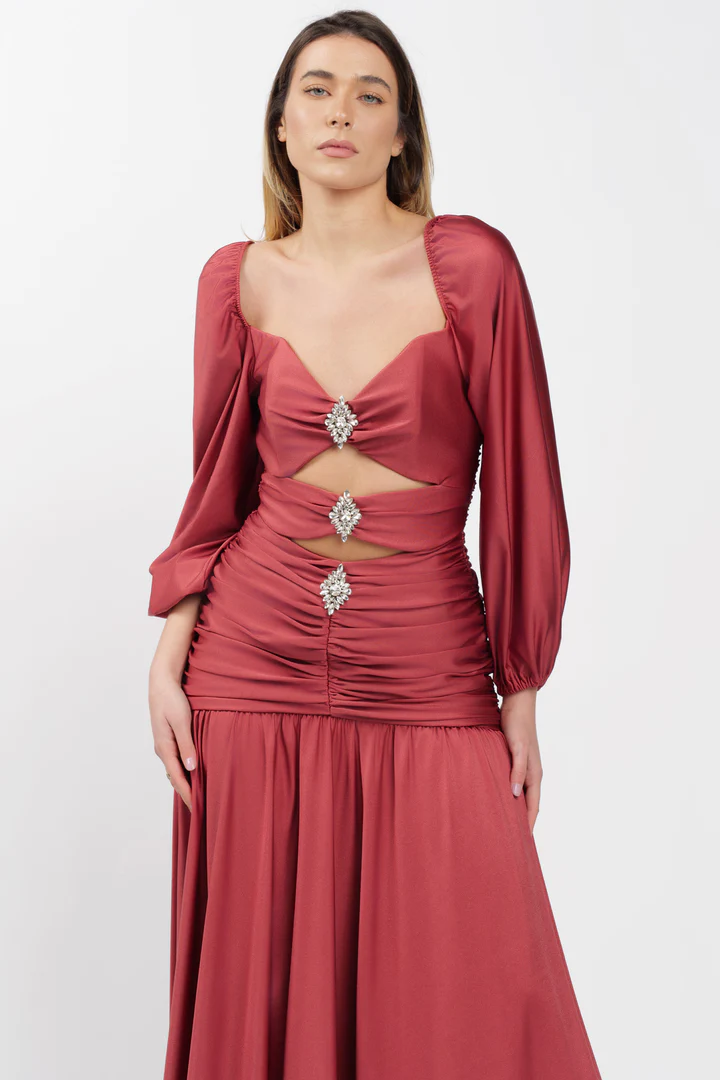 Exclusive Unique Dress, perfect for special occasions and unforgettable events. Featuring a wide gypsy style skirt, sweetheart neckline slit decorated with jewel appliqués. Long sleeve with elastic at the wrists back closure for a perfect fit. Elegance combines with comfort for a unique and refined look.