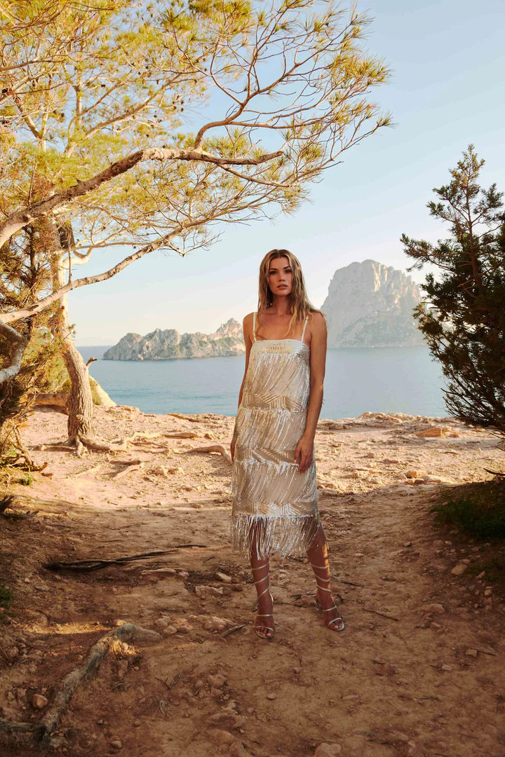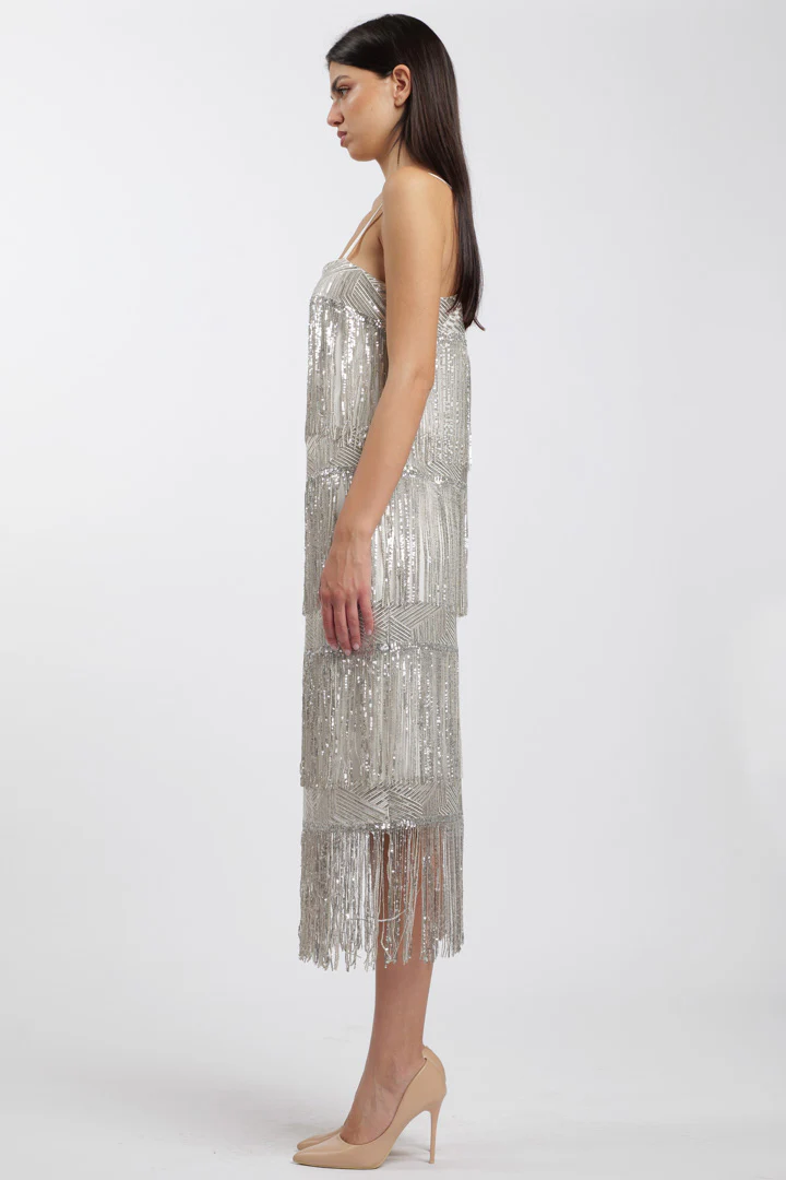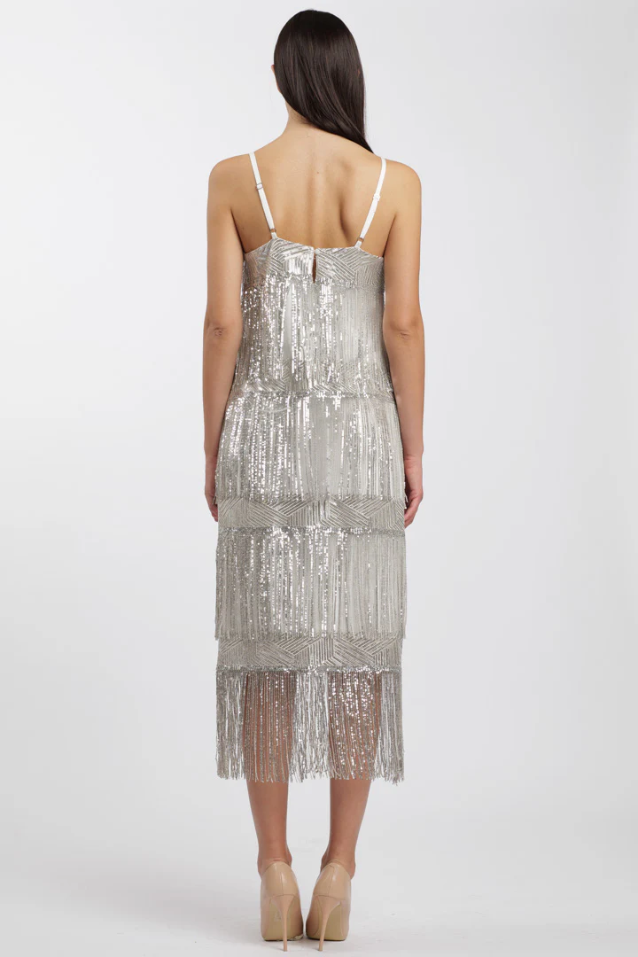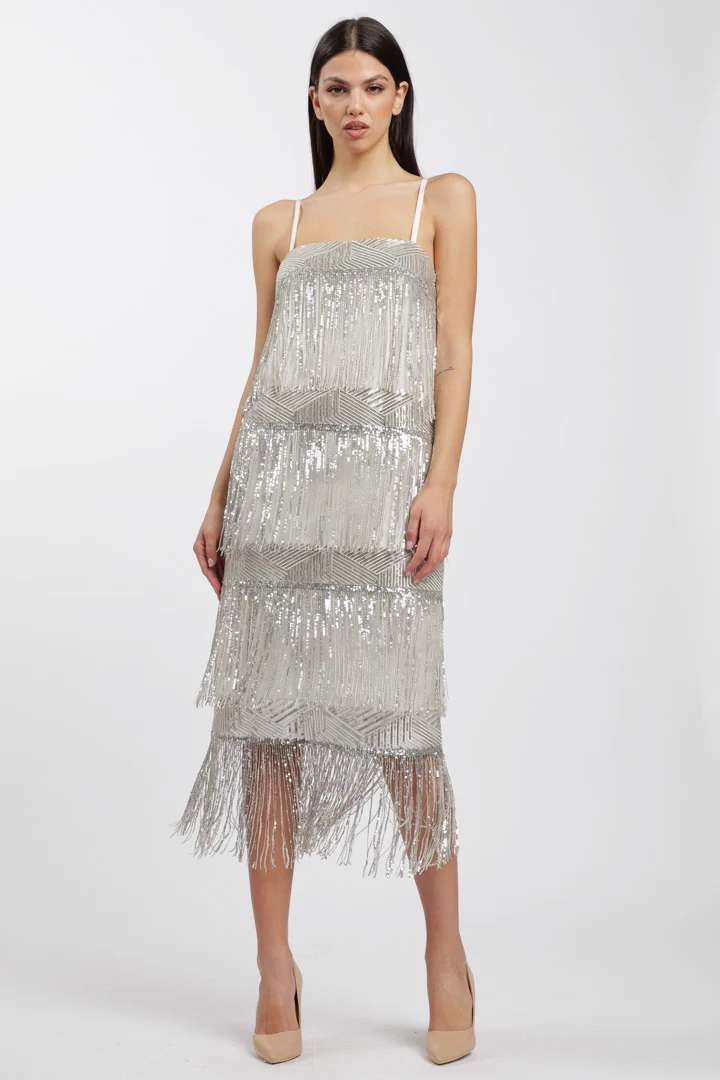 Add a touch of luxury to your wardrobe with our Mya Dress. With its layered “Charleston” style with fringe and hanging sequins, this dress is perfect for parties and events. The perfect way to express your uniqueness and 20’s style.