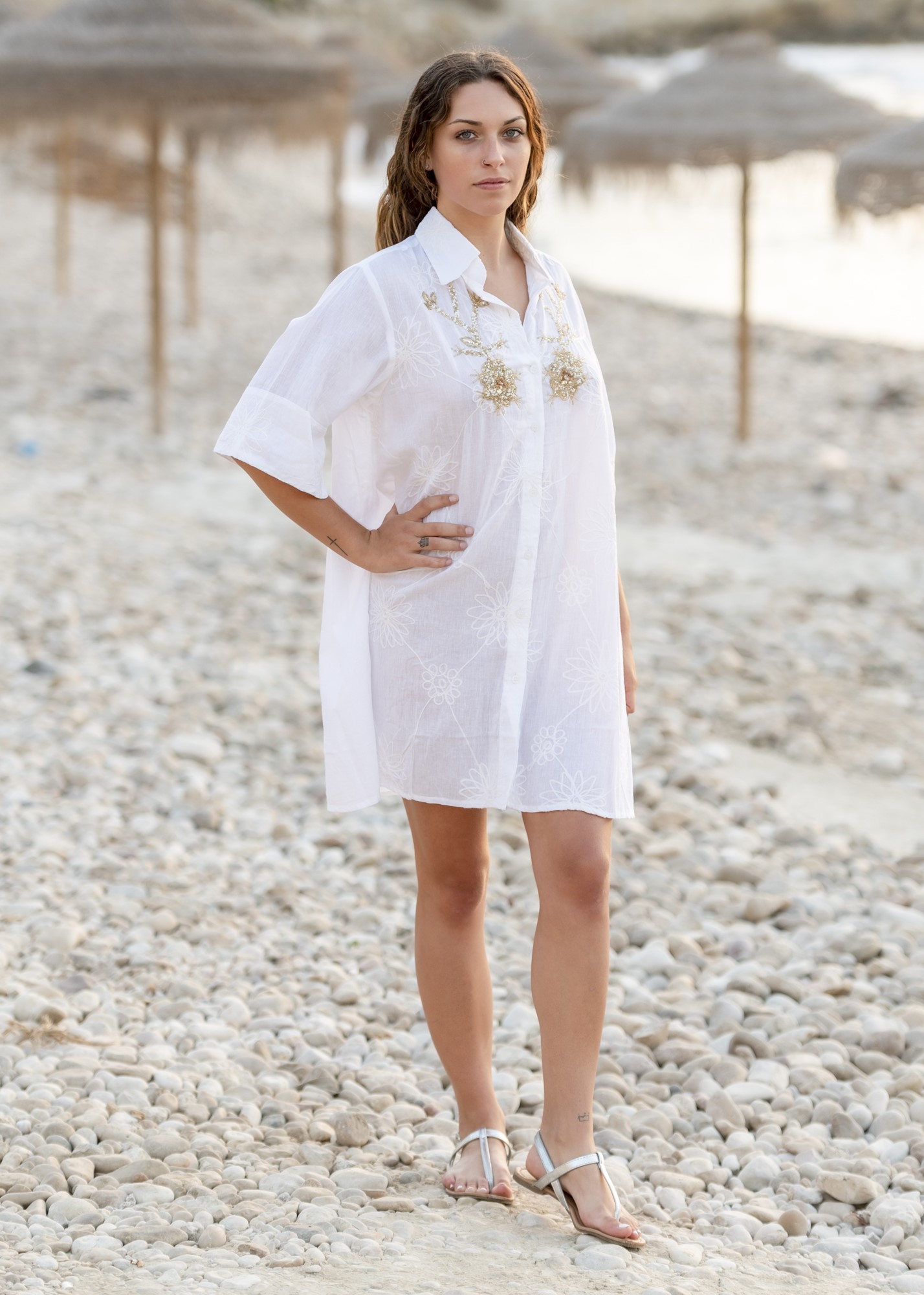 Isla Bonita Embroidered With Gold Biting Shirt Dress 100% Cotton