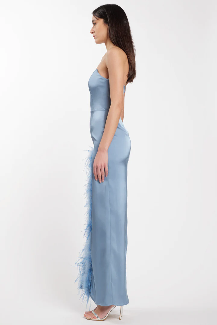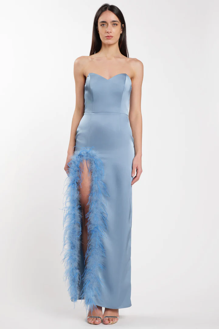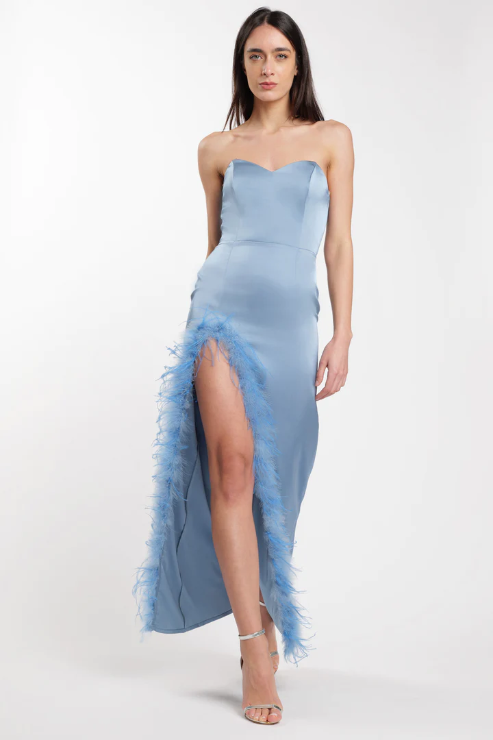 This long satin fabric gown features a sweetheart neckline and a special slit with feathers along the entire length, adding a touch of elegance and sensuality. Perfect for special occasions or important evenings, this dress will make you feel confident and sophisticated.