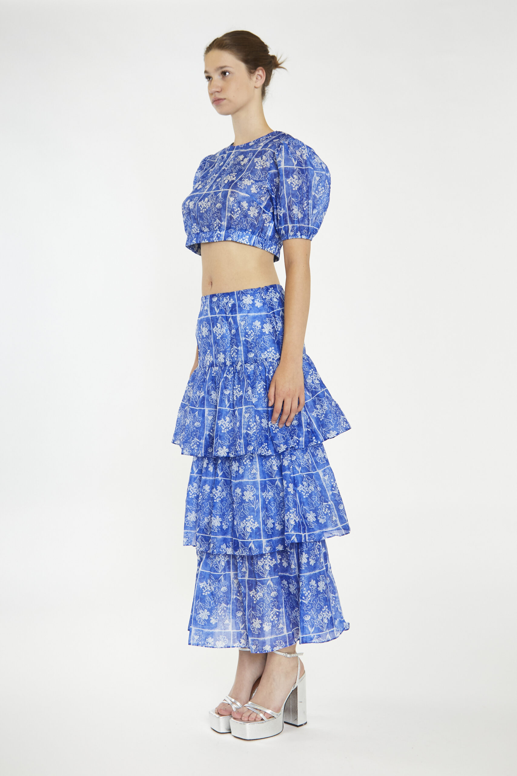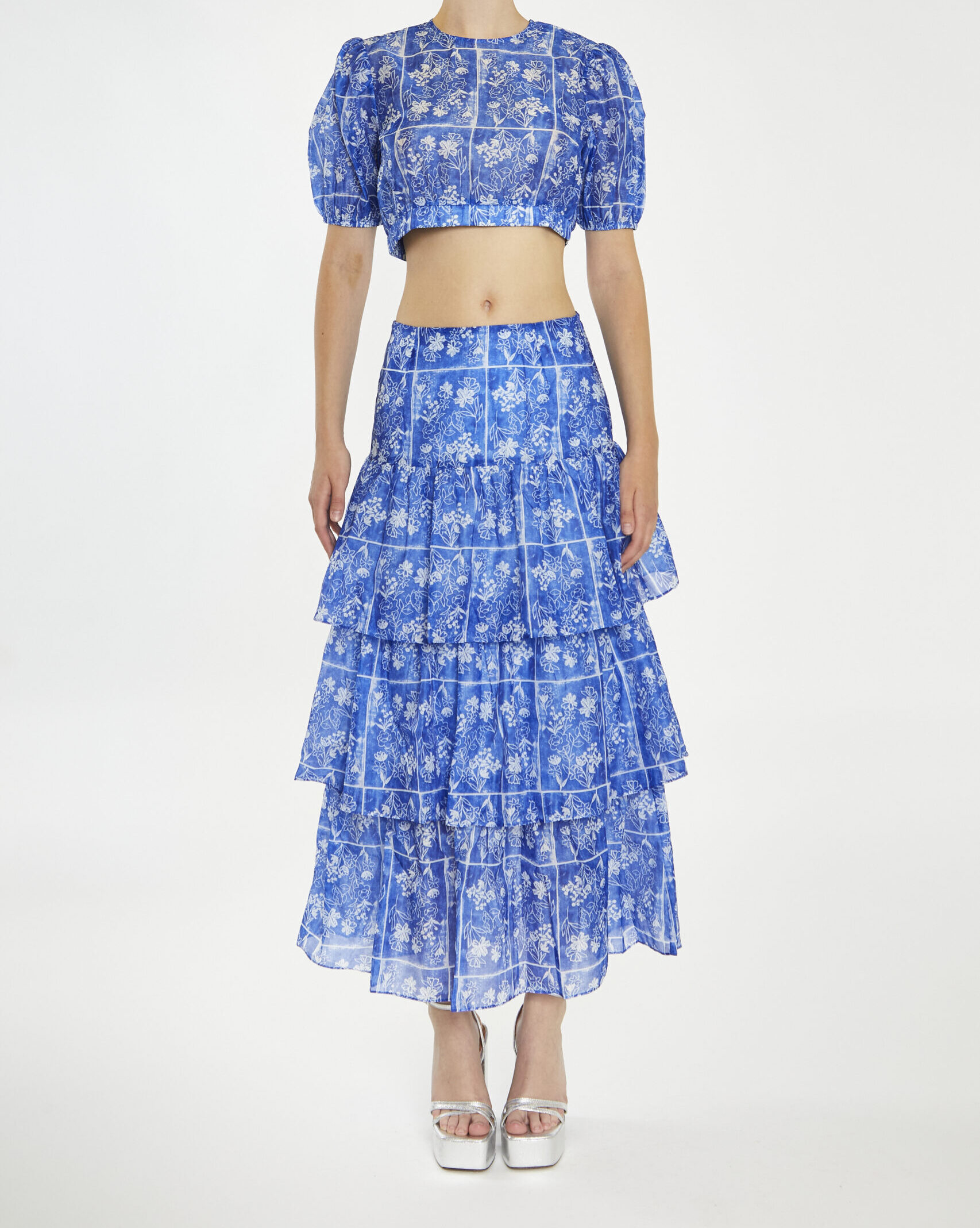 Women’s Blue, printed raffled long-Skirt. Add some sass to your wardrobe with our blue raffled long-Skirt. Featuring a ruffled layering design for a flattering fit and that adds a touch of whimsy. The long length also keeps it fun and flirty. Paired with the matching top, this is the perfect look for a night out on the town!